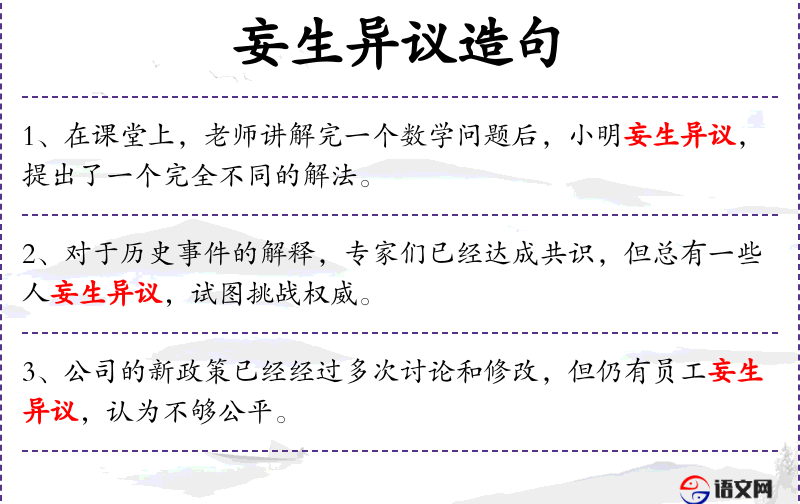 - “试图挑战权威”:动词短语作状语,说明“妄生异议”的目的。