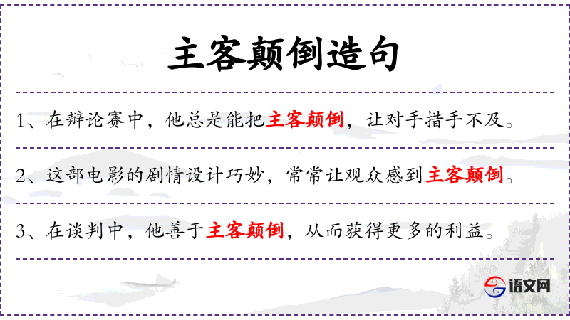 - 主客颠倒:通常指在文学或艺术作品中,主角和配角的角色或视角发生反转。