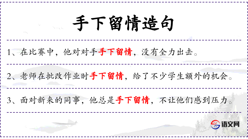 - 手下留情:比喻在处理事情时有所宽容,不严格要求。