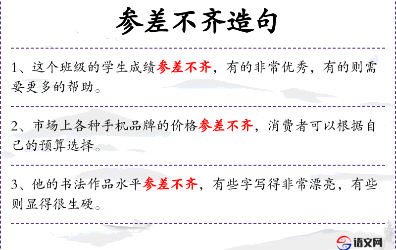2. 【参差不齐】 参差:长短、高低不齐。形容水平不一或很不整齐。