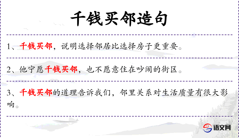 - 千钱买邻:这是一个成语,源自《左传·僖公二十五年》,意为“千金难买好邻居”,强调好邻居的重要性。