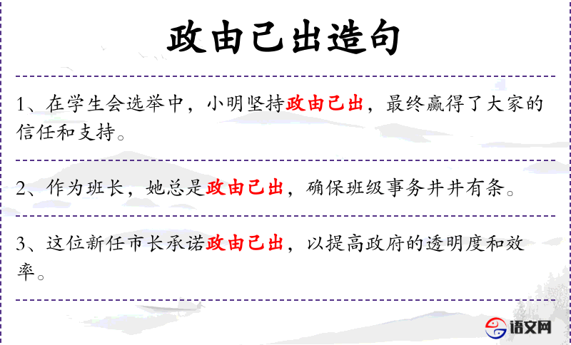 句子中“政由己出”可能蕴含了**文化中对领导者的期望,即领导者应该有主见和决策能力。同时,“井井有条”也是一个常用的成语,强调秩序和条理。