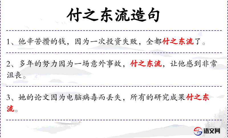 - 付之东流:这个成语来源于古代,比喻努力或投资白费,一无所获。它反映了人对于努力和投资结果的重视。