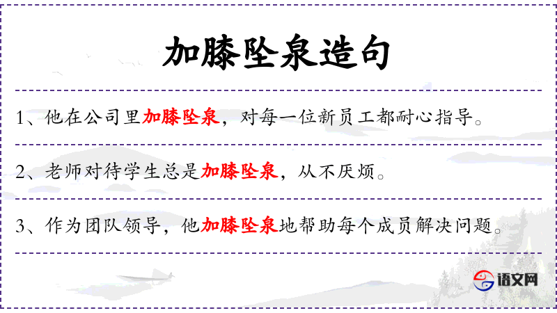 - 可以尝试用更常见的表达来替换“加膝坠泉”,例如“全心全意”或“尽心尽力”。