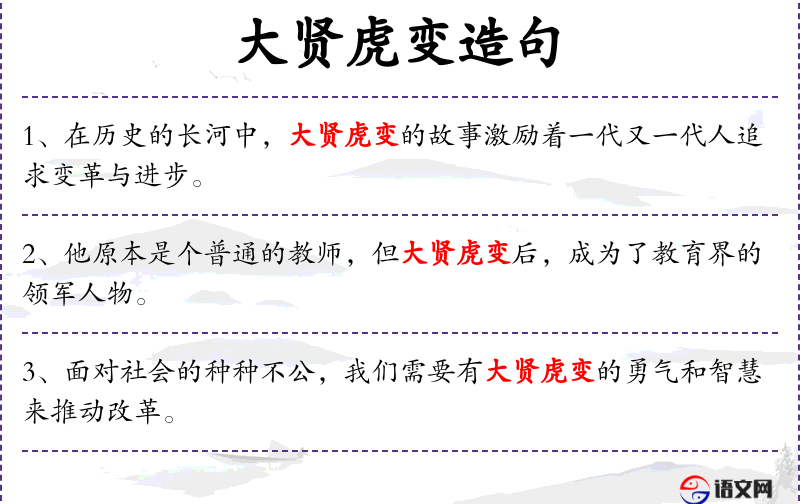 - 大贤虎变:指在成长过程中,具有卓越智慧和能力的人能够灵活应变,不断超越自我。