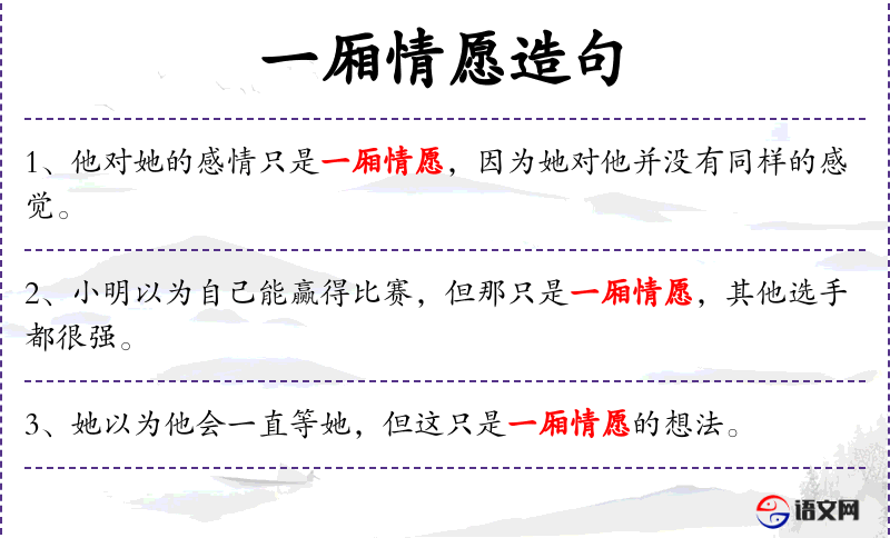 - 一厢情愿:成语,表示单方面的愿望或想法。