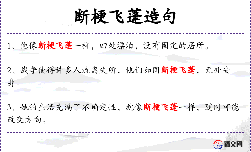 - 断梗飞蓬:成语,比喻生活不安定,四处漂泊。