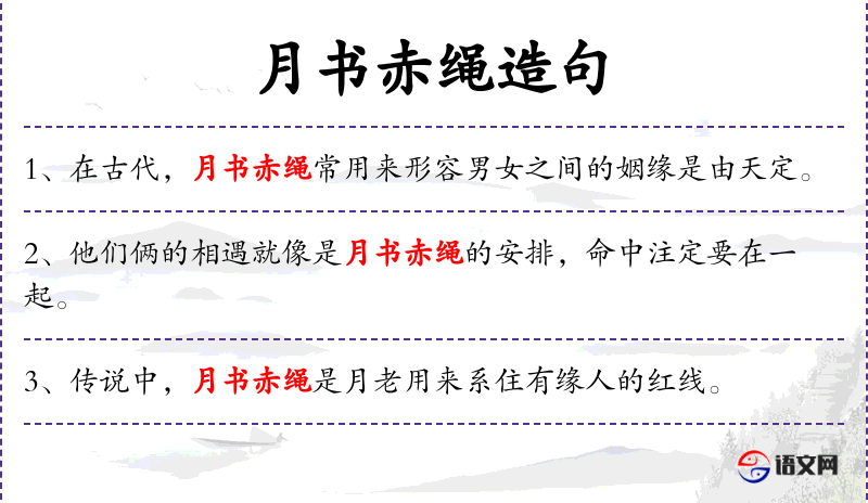 1. 【月书赤绳】 - 月书:月下老人的婚书;赤绳:月下老人用以牵系婚姻的红绳。指已定下的婚约。