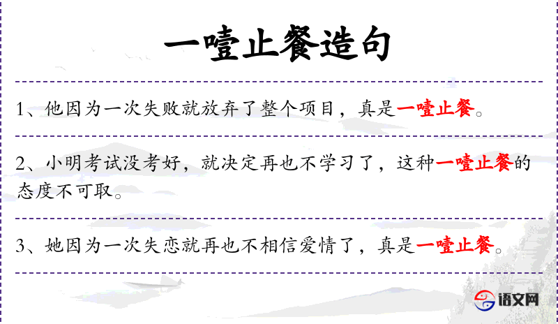1. 【一噎止餐】 - 犹因噎废食。比喻要做的事情由于出了点小毛病或怕出问题就索性不去干。