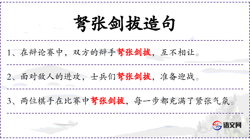 • 弩张剑拔:这个成语源自古代战争场景,形容双方准备战斗的紧张状态,用于比喻现代的争论或辩论场景。