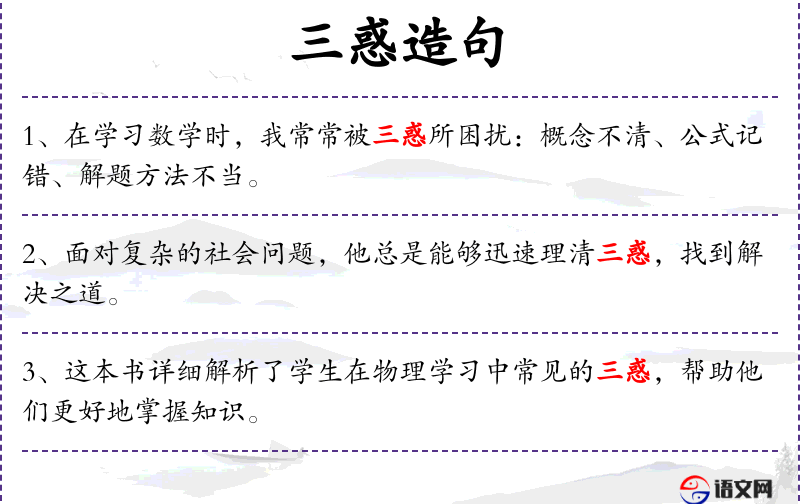 2. 【三惑】 指酒﹑色﹑财三种惑人之物; 佛教天台宗所说的三种妄惑见思惑﹑尘沙惑﹑无明惑。