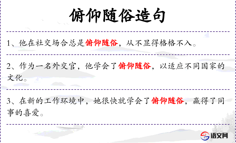 - 俯仰随俗:指适应当地的风俗习惯,随和地融入当地社会。