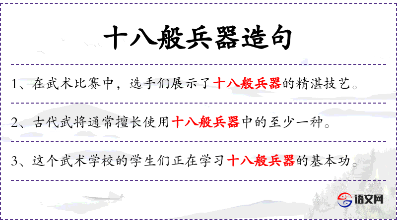 - 十八般兵器:**传统武术中指的十八种基本兵器,如刀、枪、剑、戟等。