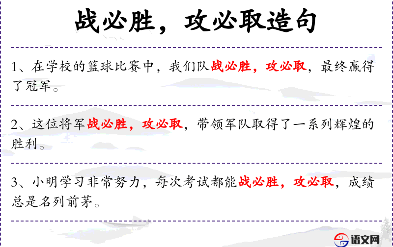 - 战必胜,攻必取:这个成语源自**古代军事策略,强调决心和能力,在现代语境中常用于形容团队或个人的坚定和成功。