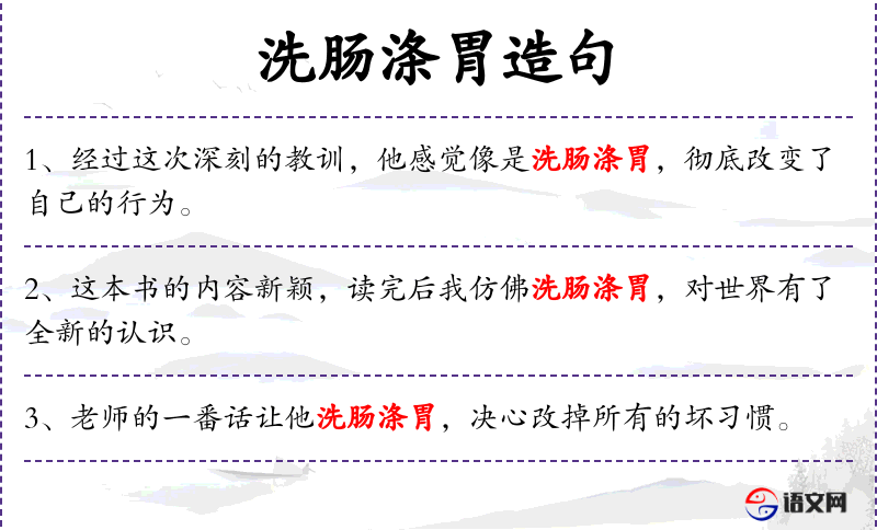 1. 【洗肠涤胃】 - ①比喻彻底清除。②比喻彻底改过。