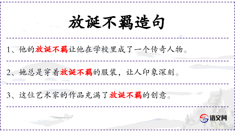 - 放诞不羁:形容词短语,意指行为或风格自由、不受拘束,常用于形容艺术家的创作风格。