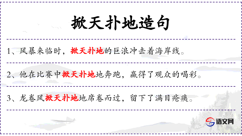 - 成语、典故:“掀天扑地”是一个形容词组,用来形容声势浩大、力量强大的场景。