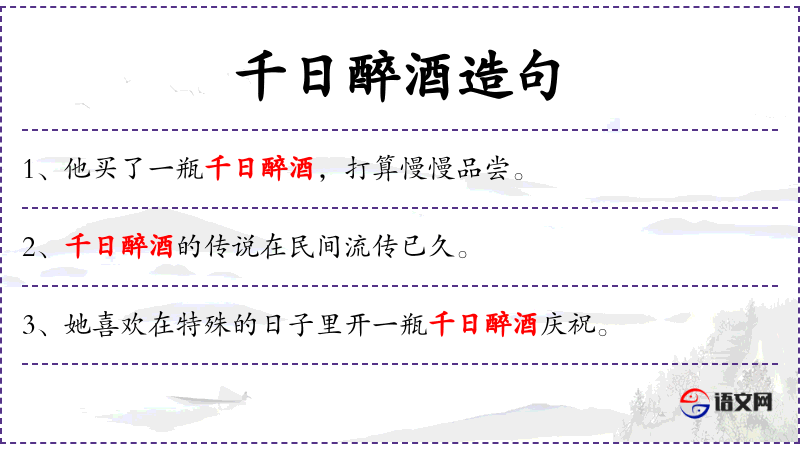 - 千日醉酒:名词,可能是一种特殊的酒,暗示其陈年或品质。