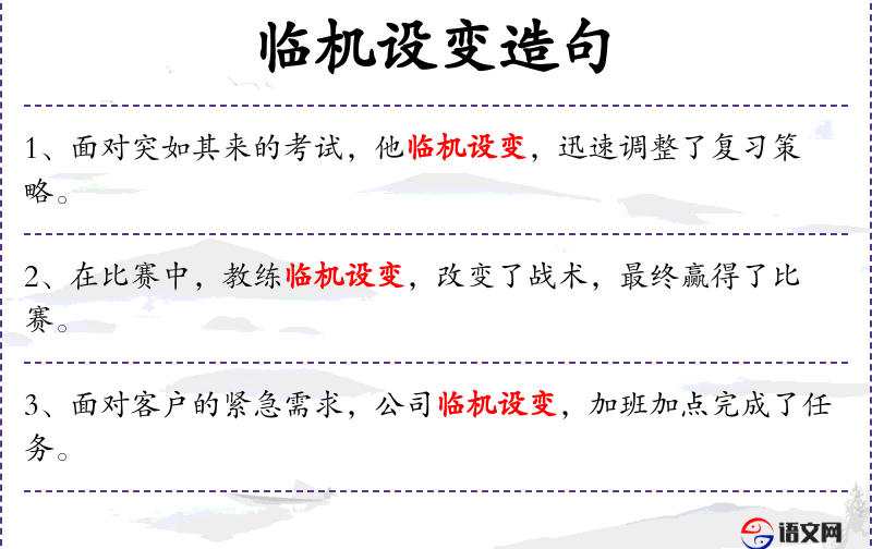 - 句子中“临机设变”体现了中文文化中对灵活应变和创新思维的重视。