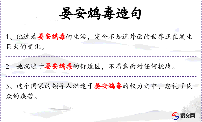 2. 【晏安鸩毒】 - 晏:安逸;鸩:传说中的毒鸟,用其羽毛泡酒,有剧毒。指贪图享乐等于喝毒酒自杀。