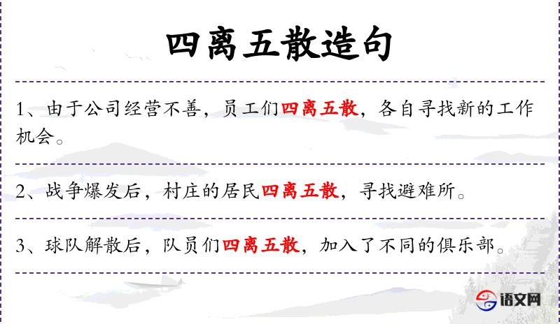 句子中“四离五散”是一个成语,形容人们分散到各个地方。这个成语在**文化中常用,反映了人们对分散、离别的普遍感受。