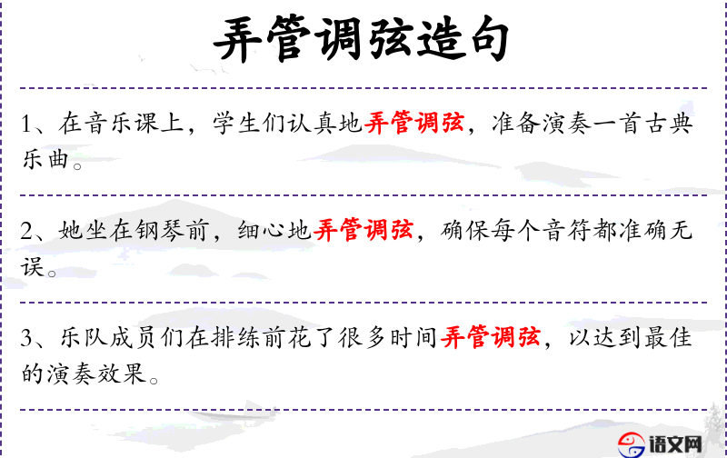 - 弄管调弦:指调整乐器(如弦乐器)的音准,确保演奏时音准正确。