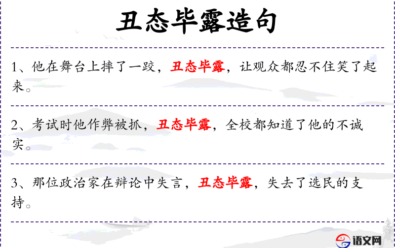 1. 【丑态毕露】 毕:完全。丑恶的形态彻底暴露。