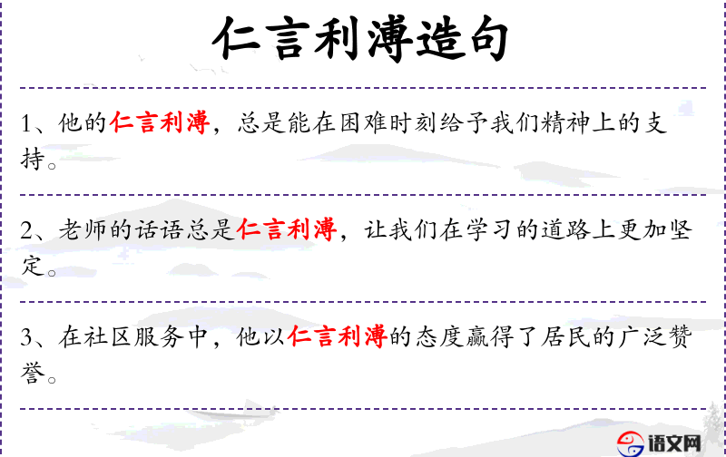 “仁言利溥”这个成语体现了**传统文化中对仁爱和有益于人的话语的重视。了解这个成语的背景可以帮助更好地理解句子的文化内涵。