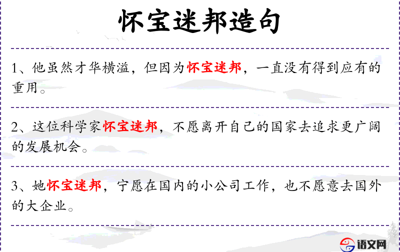 - 怀宝迷邦:比喻有才能的人因为某种原因而未能得到施展。