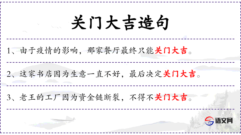 - 相关成语:“关门大吉”与“生意兴隆”形成对比,后者表示生意繁荣。