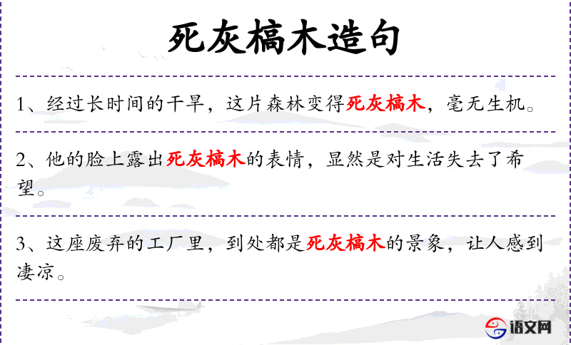 1. 【死灰槁木】 - 冷了的灰烬,枯槁的树木。比喻毫无生气或意志消沉,对世事无动于衷。