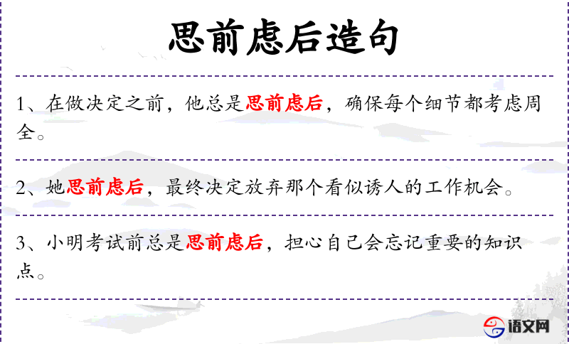 - “思前虑后”是文化中常见的表达方式,反映了人注重深思熟虑的特点。