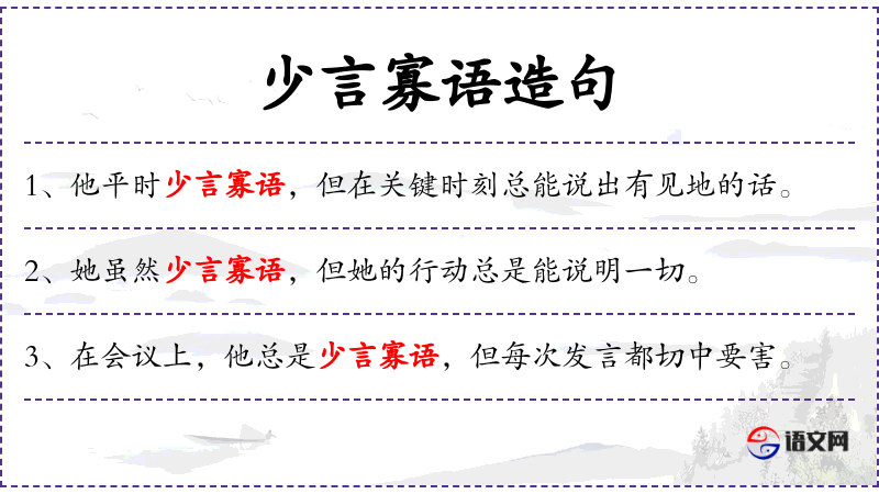 - 少言寡语:成语,形容说话不多,沉默寡言。