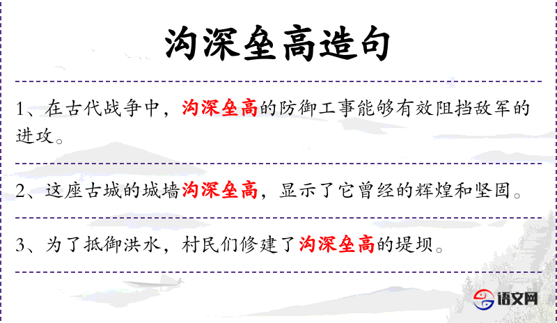 1. 【沟深垒高】 沟:壕沟;垒:堡垒。深挖沟和高筑墙。指坚固的防御工事。