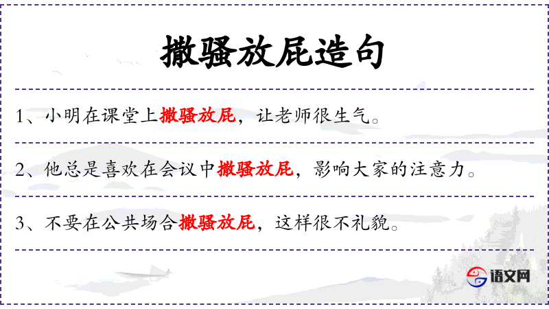 - 撒骚放屁:动词短语,通常带有贬义,指不恰当或不得体的行为。