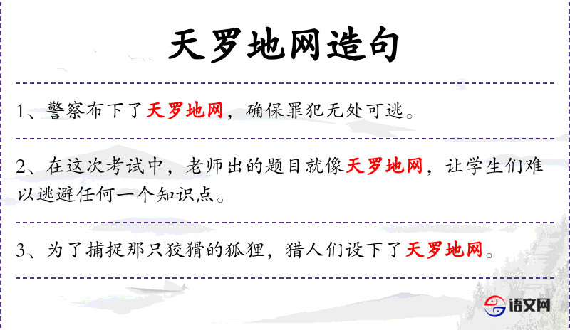 - 天罗地网:这个成语源自**古代,形容包围严密,无处可逃。