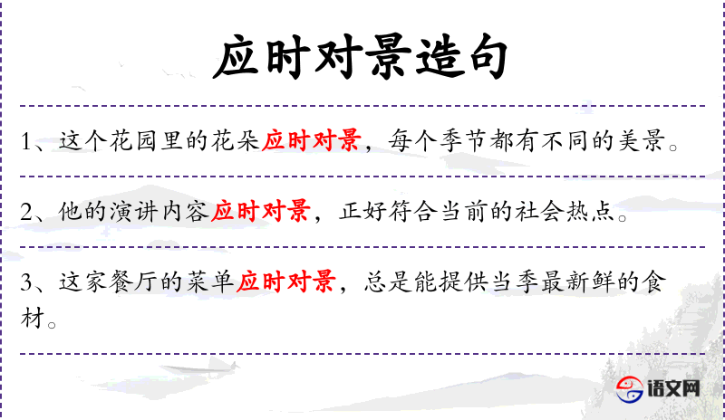 1. 【应时对景】 应:适合;对:相合。适合当时的情景。