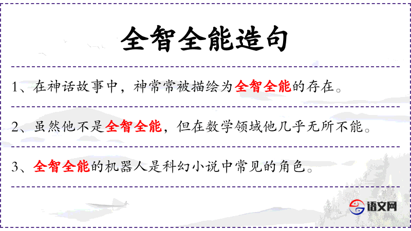 - 全智全能:完美无缺、无所不能,与“omnipotent”或“all-powerful”对应。
