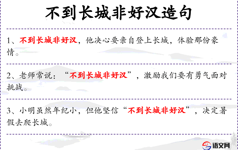 - 不到长城非好汉:这是一个成语,意思是如果不到达长城就不是真正的勇士。