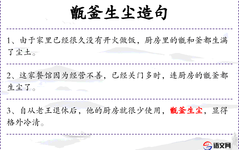 3. 【甑釜生尘】 - 甑:古代蒸食的炊具。甑里积了灰尘,锅里生了蠹鱼。形容穷困断炊已久。也比喻官吏清廉自守。