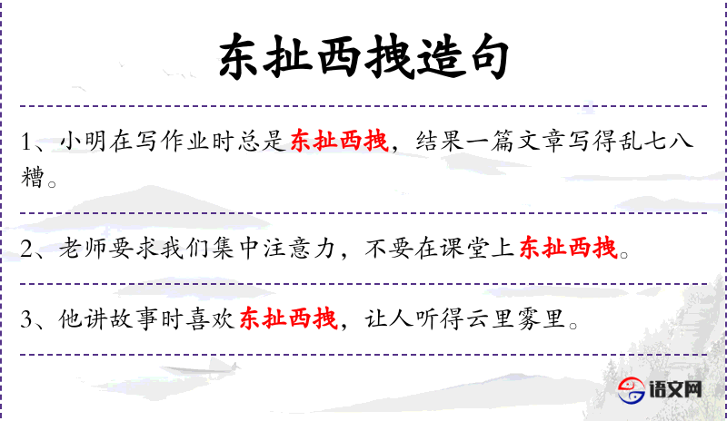 “东扯西拽”是一个中文成语,形象地描述了说话或写作时的无序状态。这个成语反映了中文文化中对语言表达条理性的重视。