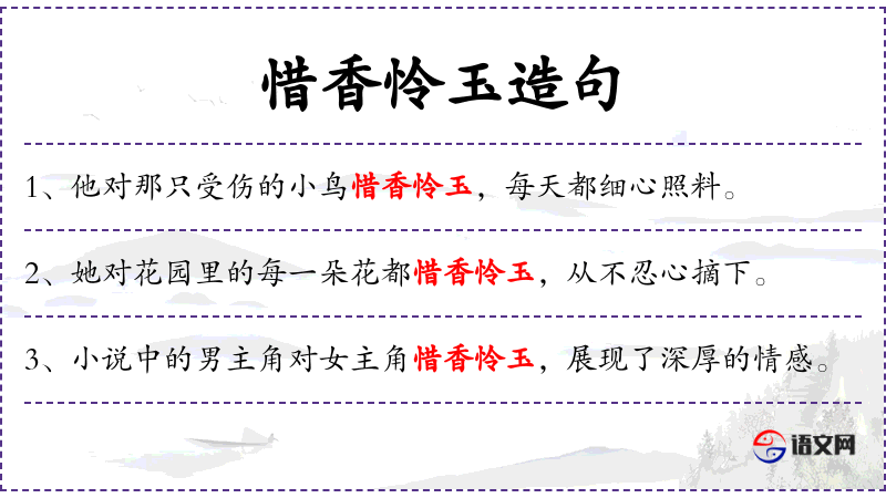 1. 【惜香怜玉】 怜、惜:爱怜;香、玉:比喻女子。比喻男子对所爱女子的照顾体贴。