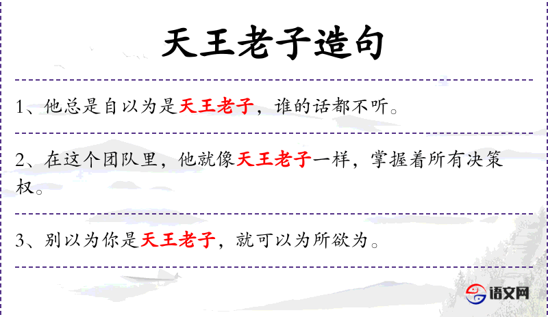 - 宾语:“自以为是天王老子”是一个动宾结构,其中“天王老子”是宾语,表示一种自大的态度。