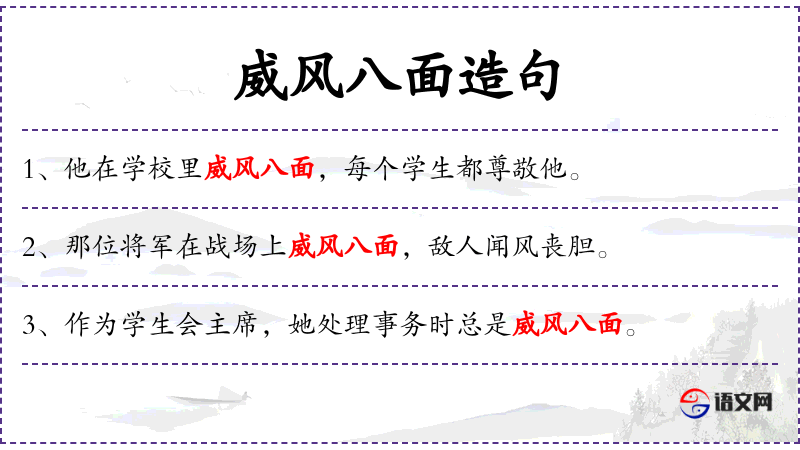 • 威风八面:成语,形容某人非常有威严,到处受人尊敬。