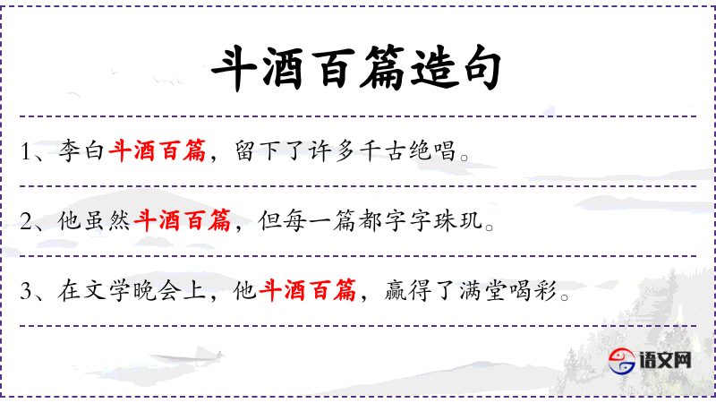 “斗酒百篇”是一个成语,源自**古代文人的饮酒作诗传统。这个成语体现了文人墨客在饮酒时的创作激情和才华。了解这一文化背景有助于更好地理解句子的深层含义。