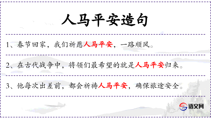 - 宾语补足语:“愿人马平安”,补充说明“一句话”的内容。