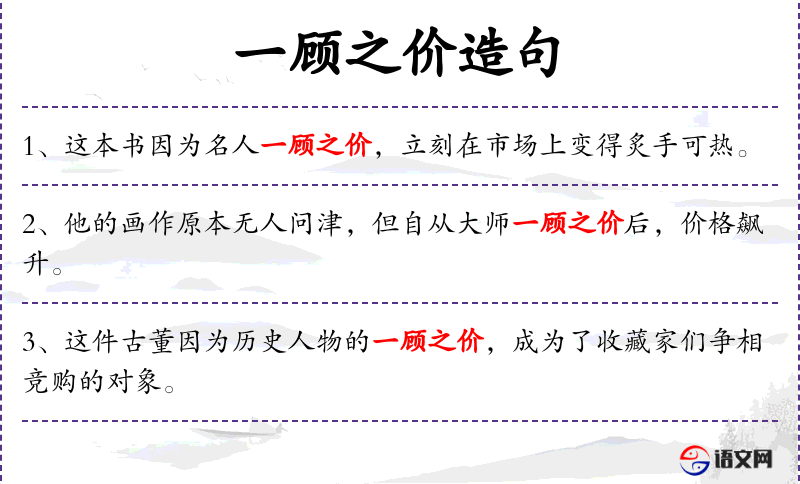 1. 【一顾之价】 顾:看。古之善于相马者伯乐看了马一眼,良马的身价就值千金。比喻得到贤人推荐而使人或事物身价倍增。