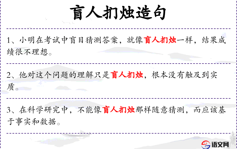 5. 【盲人扪烛】 比喻只凭片面了解或局部经验就对事物妄加判断。同“盲翁扪籥”。