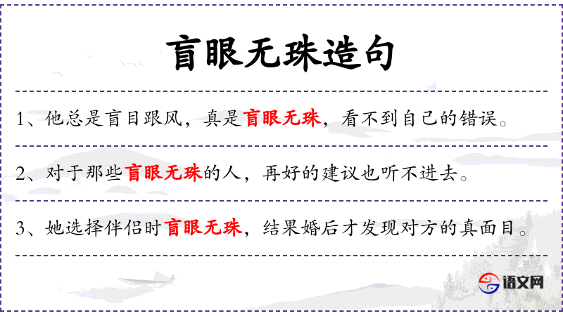 4. 【盲眼无珠】 瞎了眼,没了眼珠子。形容对眼前的事物一无所知。也比喻不识事理。