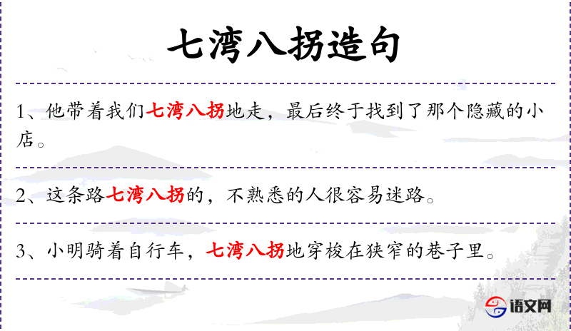 句子中的“七湾八拐”是一个典型的汉语成语,常用来形容道路或路线的复杂和曲折。这反映了汉语中对空间和路径描述的丰富表达方式。
